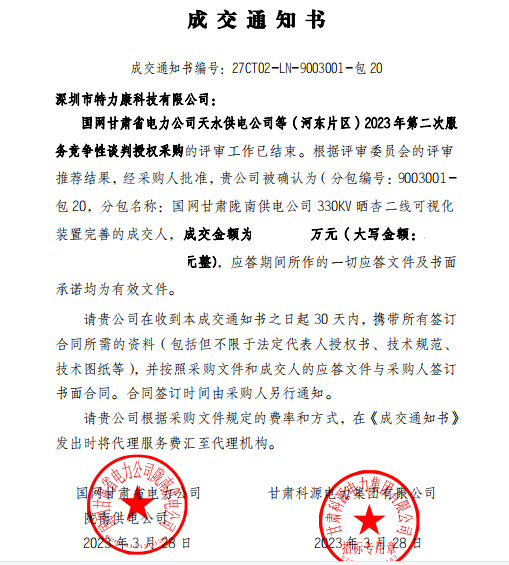 特力康中標國網(wǎng)黑龍江送變電工程公司的2024年度第18次物資類競爭性談判采購項目——慶陽驅(qū)鳥器物資框 特力康中標國網(wǎng)甘肅省電力公司省管產(chǎn)業(yè)單位2024年第五次物資競爭性談判授權(quán)采購項目 中標喜訊:深圳市特力康科技有限公司成功入圍許繼集團綜合能源公司輸電線路視頻在線監(jiān)測裝置模塊集采項目 中標喜訊:特力康成功中標國網(wǎng)重慶市電力公司渝中一片區(qū)項目 特力康成功中標國網(wǎng)天津市電力公司2024年第二次?物?資招標項目 特力康中標國網(wǎng)安徽省電力有限公司蕪湖供電公司2024年3月非物質(zhì)采購項目 重慶變電站“防鳥衛(wèi)士”:特力康一體化驅(qū)鳥器守護山城電網(wǎng) 特力康輸電線路智能AI多目監(jiān)控裝置+傾斜監(jiān)測守護山西輸電生命線 鄂網(wǎng)“全景眼”:特力康一體化視頻監(jiān)控系統(tǒng)守護輸電線路 山東電網(wǎng) “穩(wěn)塔哨兵”:特力康智能桿塔傾斜監(jiān)測預(yù)警裝置筑牢電力桿塔安全防線 特力康科技輸電線路高清圖像監(jiān)控裝置,為河南輸電通道筑牢安全屏障 黃土高原護塔穩(wěn):特力康傾斜監(jiān)測裝置為山西電網(wǎng)筑牢根基 黔山冰防線:特力康 “數(shù)據(jù) + 圖像” 雙監(jiān)測守護貴州輸電線路 戈壁林區(qū)的 “火情哨兵”:特力康紅外熱成像裝置守護甘肅輸電線路 內(nèi)蒙電網(wǎng)裝上 “舞動監(jiān)測眼”:特力康輸電線路防舞動監(jiān)測系統(tǒng)守護線路安全 寧夏配電線路安裝了我司防外破電子化智能警示牌